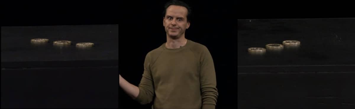 Three Kings, by Stephen Beresford, is the story of a young man’s on again, off again relationship with his charming, narcissistic father and how the two are unfortunately unlike. Three Kings refers to a coin trick which appears several times throughout the play. This Old Vic In Camera production is a one man show, written specifically for Andrew Scott during quarantine.