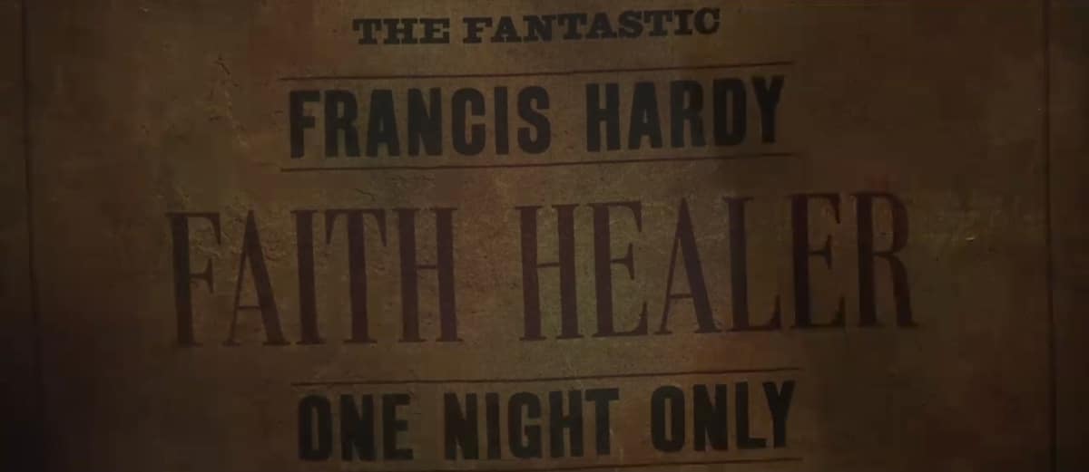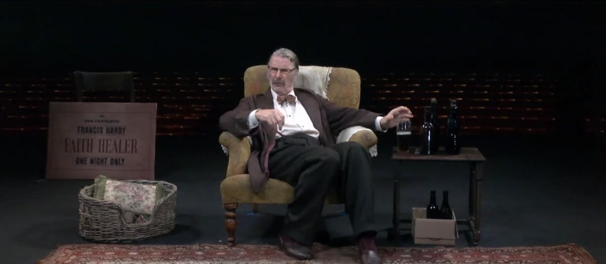 Faith Healer, written by Brian Friel, features four monologues by three characters who never occupy the same place at the same time. The play is about Francis Hardy, a faith healer who performs miracles 10% of the time. We hear monologues from Francis (Michael Sheen), his wife Grace (Indira Varma), stage manager Teddy (David Threlfall), and Francis again. Each monologue questions the narrative of the prior monologue.